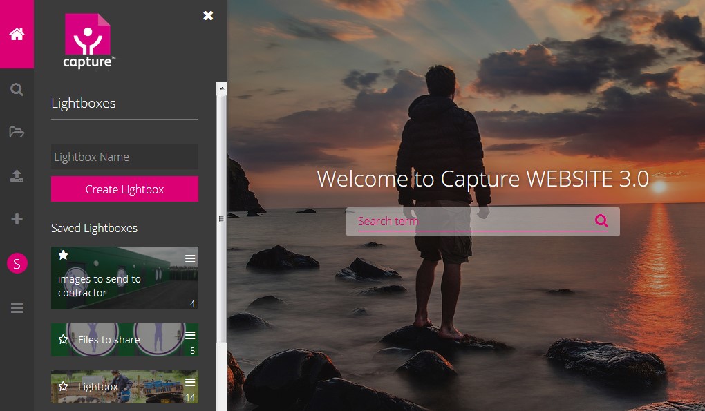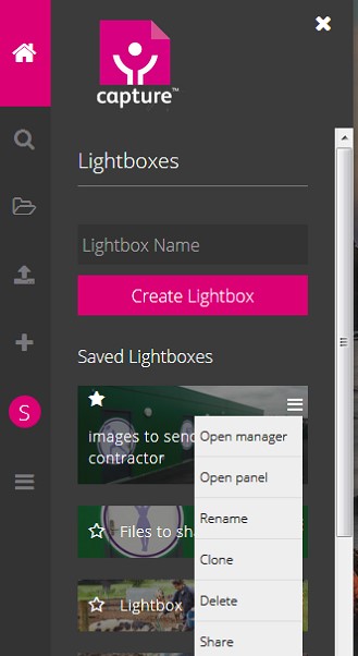 Click on the + icon from the menu bar on the left to view the Lightboxes area (figure below). From here you can view existing lightboxes or create a new one. To create a new lightbox, enter the lightbox name, and click on the Create Lightbox button. The lightbox will appear under “Saved Lightboxes” below. To make it the default lightbox, click on the star symbol to the left of the lightbox name. To the right of the lightbox name you will see the mini-menu symbol.